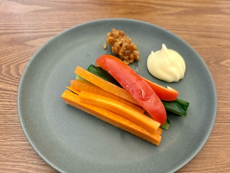 続いて登場したのは、旬野菜を自家製マヨネーズともろみ味噌で味わう一皿。野菜はどれも瑞々しく、素材の味が濃い。コクのある自家製マヨネーズともろみ味噌が加わることで、自然とお酒も進みます。