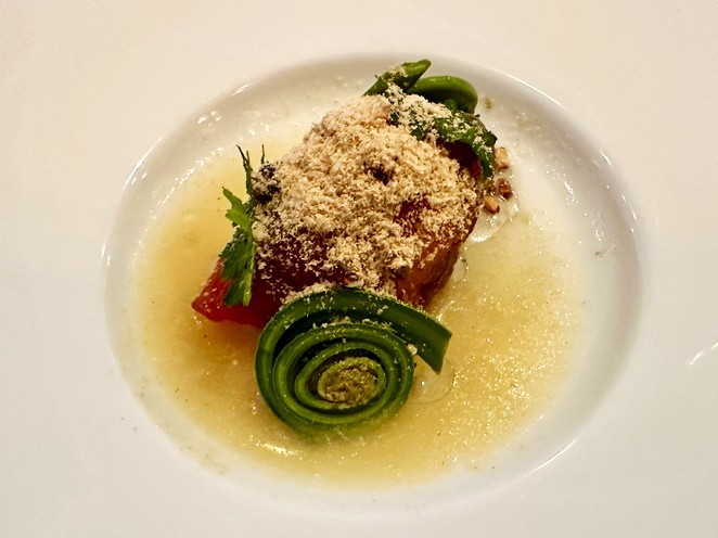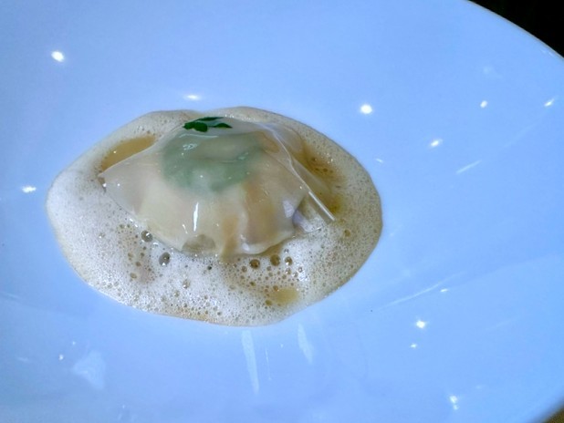 三皿目のトリッパは、香港のKevin Wong氏によるものです。フレンチの古典的な内臓料理であるトリップをシンガポールのチキンライスと結びつけ、さらにスープを注ぐことでバクテーの記憶へと変化させます。この皿は、植民地的な歴史を持つアジア都市に共通する、多層的な食文化を象徴していました。高級料理と日常食の境界がうまく溶け合っています。