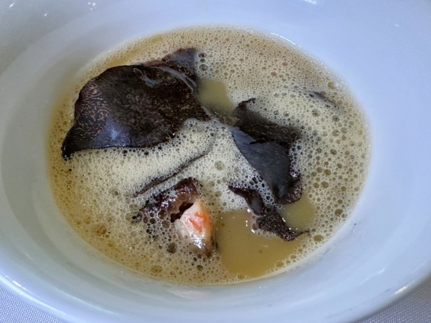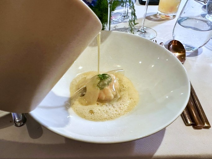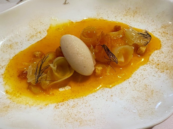 続くラングスティーヌは、シンガポールの三つ星レストラン【オデット(Odette)】を率いるJulien Royer氏の皿。ヴァン・ジョーヌと鰹節という、一見遠い文化の素材を、発酵と熟成という共通言語で結びつけます。彼はフランス料理の技術を基盤にしながら、アジアの文脈で再定義してきたシェフであり、この一皿はそのひとつの到達点とも言えるものです。
