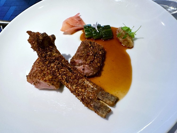ラムの皿は、シンガポールの若手シェフIan Goh氏です。スモークしたラムに海藻、レーズンのチャツネ、ミントを合わせ、野性味の強い素材を多層的に制御します。ここでは中東から東南アジアにかけてのスパイス文化や味覚が交差し、アジアという広域の中での新たな調和が提示されます。
