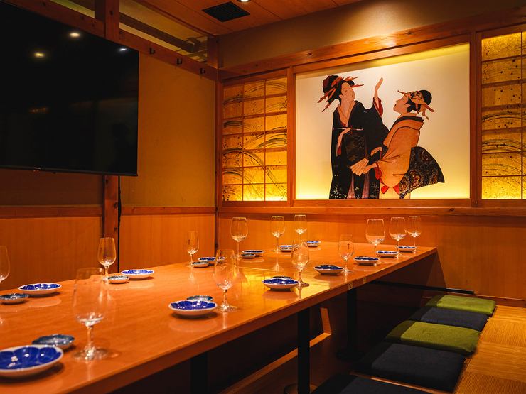 店内は50席を超える広々とした造り。板前の手捌きを間近で見られるカウンター席は、食のエンターテインメントを楽しみたいゲストに。一方で、日本文化を感じられるお座敷席は、足を伸ばして寛げる「掘りごたつ式」になっており、長時間の会食でも疲れを感じさせない配慮がなされています。